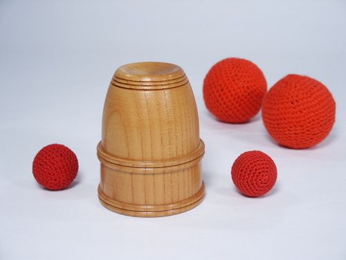 This wood turned cup in natural wood finish 3 1/4” high with a 2 1/2” mouth diameter. Along with the chop set of balls in 1 1/8” there are two additional giant load balls that are 2 1/8” in diameter. Condition very fine.