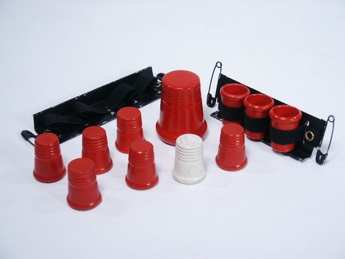 Set includes 9 thimbles turned of wood that are red in color and a single white thimble that nests into a jumbo finale red wood thimble. Also included are two undercoat metal thimble holders one that holds three and the other holds four pinned out of sight. Condition very fine.