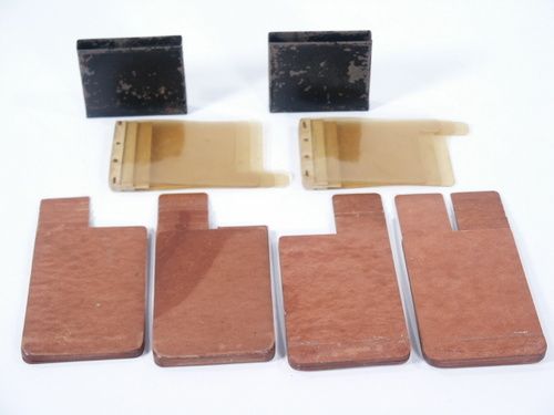 Four are in a fiberboard materiel and two are in celluloid with old metal containers that have paint coming away. Condition good.