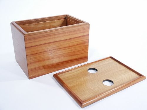 A box shown without top or bottom is placed upon a tray and silk productions, changes and vanishes happen in a mysterious way. Beautiful wood grains and hallmark stamped. Condition very good.