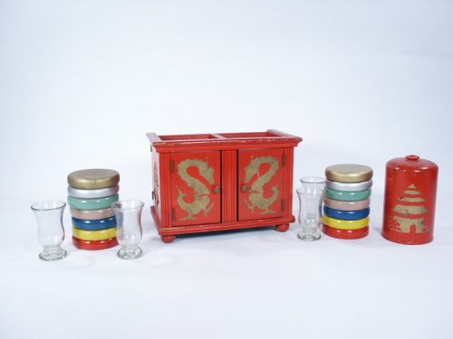 By Haenchen and Company. A cabinet measuring 12” wide x 8 1/4” high x 7” deep is shown with a stack of 7 different colored checkers 4” in diameter and a cover for same. The front and back doors are opened to show empty and then closed. Three glasses of water and two large silks are produced! The checker cover is shown empty and placed in one side of the cabinet and checkers placed in the other side with doors then closed. The doors are opened and cover raised showing the checkers have changed sides passing through the solid partition and the metal cover! The cover is placed over one of the glasses of water on the table and then magically the checkers are now under the cover and the glass of water is in the cabinet! The glass now passed back to the cover on the table while the checkers pass into the other side of the cabinet. The magician then produces a fourth glass of water. The cabinet is made of wood as well as the checkers. Includes 4 glasses, silks not supplied. This is an early effect and certainly shows the wear of time and is in quite rough condition and should be sold with that in mind. Includes 2 pages of instructions. Auctioned in as is condition.
