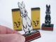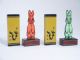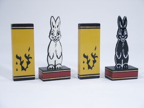 This is an absolutely beautiful set in micro size of the Hippity Hop Rabbits. beautifully made and at times mistaken for the work of Eddy Taytelbaum. These stand 94 mm (almost 3 3/4" high) and are completely deceptive in the finale change of color at the finish of routine. This set is beautiful and will be a centerpiece of a micro magic collection. Collectors condition. | |