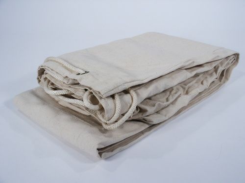 Bag is 67” long and 35” wide made with brass grommets with plenty of rope in this version plenty of slack is taken up inside the bag prior to tying. No instructions. Condition very fine.