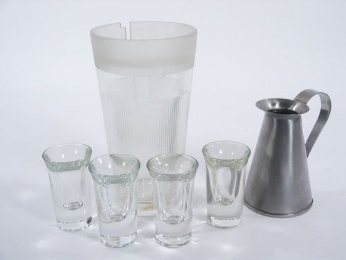 A beautiful set made by Merv Taylor with stainless steel pitcher along with four special glasses and large malt glass with special gimmick all in first rate Collectors condition. Pitcher is hallmark stamped. Includes instructions for this mystifying liquids effect. | |