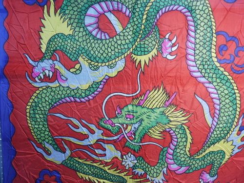 This Dragon Silk is with blue border. A few sequins have been added and loops at border. Condition bottom right hand corner has a few minor spots that appear to have been liquid spills otherwise fine.