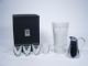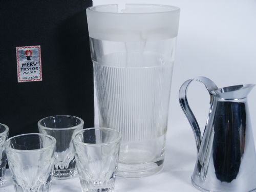 A beautiful set made by Merv Taylor found new in original box with original packing still around glasses. Includes stainless steel pitcher along with four special glasses and large malt glass with special gimmick all in first rate Collectors condition.