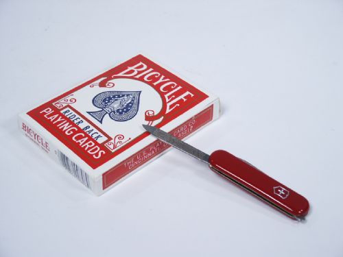 A chosen card is stabbed out of Mid-Air with a pocket knife. Comes complete with Swiss Army Knife and special deck. Includes instructions. Condition very fine.
