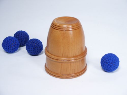 This wood turned cup in natural wood finish 3 1/4” high with a 2 1/2” mouth diameter. Includes 2 extra balls along with the standard chop set. Cup is in First Rate Collectors condition.