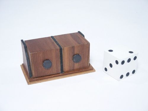 Mr. Miller has been out of production for several years and it is unlikely that items will be made again. Don't miss this opportunity to acquire this handmade item. This micro magic Die Box works on a principle unlike most Die Boxes you have seen. Sitting near by the magician has a small basket or perhaps paper sack. The magician takes a piece of rope and lowers it into the bag or basket leaving a few inches hanging outside in full view. The little Die Box which measures 4 inches wide x 2 1/8 inches deep x 1 7/8 inches high is shown and the 1 3/8 inches Die is placed within. Going through the motions of tipping the box down on one end and then the other always showing the high end empty as if the Die has vanished the sucker routine is played out. Finally both doors are lifted up showing the Die has vanished and the box is set aside. Reaching over to the piece of rope that has been seen hanging a few inches outside of the basket or bag he takes hold of it and lifts it straight up and there tied to the end of the rope is the previously vanished Die! This is a signed piece by Clarence Miller from 2005. Includes instructions. Condition very fine.