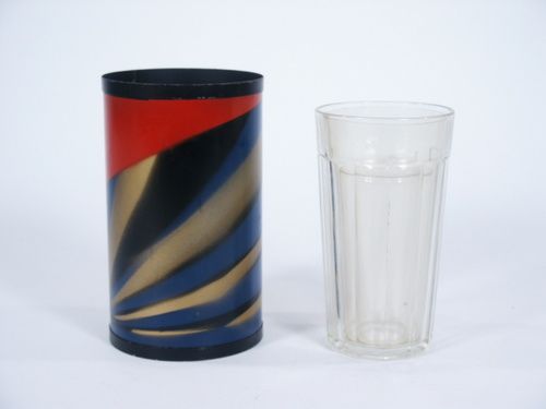 A decorated metal cylinder 6” high with a 3 5/8” diameter that looks like something from Thayer is seen resting upon saucer, tray or table top. Sugar is poured in and tube lifted away revealing a glass the sugar found its way into. Tube is shown from both ends and used to cover the glass once more. Once more it is lifted away from the glass and in place of sugar will be found candy treats or what have you. Condition very fine.