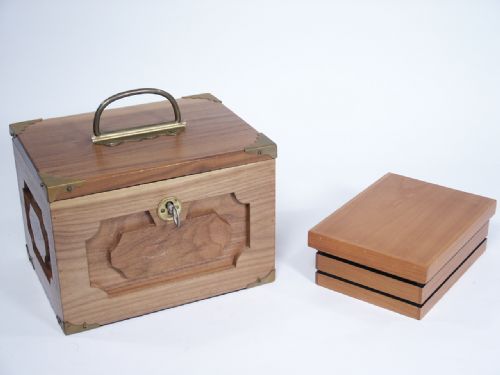 This one made by Arturo with the enhancement of an inset key lock to the chest as opposed to the hasp and loop with padlock closure. The chest is built of walnut wood with brass corner trim and measures 8” wide x 5 1/2” high x 6” deep looking much like a strong box it represents. Also included is the wood desk box which serves additional purpose for holding a key to the chest. If desired a clear plastic box may be made to contain the chest if you wish to leave this in the hands of a committee in advance of your performance. Includes 2 pages of illustrated instructions by Bob Mason with further refinements as only he could provide. Hallmark stamped by Arturo. Condition fine.
