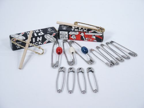 Includes *Solid Thru Solid Pin Trick by Royal (2 total) *Color Bead Divination with Large Safety Pins *4 Key Pins like Jerry Andrus style along with 5 Assorted Large Safety Pins. Condition fine.