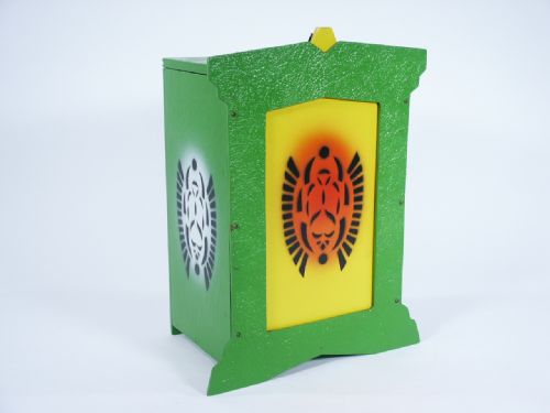 This is the large size standing 12 3/4” high x 6” deep x 7 1/2” wide. This is made of wood with stencil painted designs of Egyptian Scarabs. A large production of items may be made from this and may be used as an exchange or transformation effect as well. Condition very fine and over 50 years old!