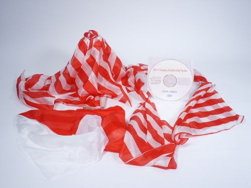 From Japan comes this nice silk effect where two silks, one is white and the other red, are changed into a striped silk with both colors. Both ends are tied and the magician starts pulling and amazingly a change occurs into that of a big circle composed of 10 striped silks! Condition very fine.