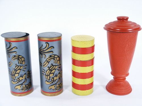 Rice is poured into a vase and set aside. An orange is covered with a decorated canister. A stack of checkers is shown removing two and hitting them together and replaced and covered with another canister. The canister with the orange is lifted away and the checkers are now in place. The vase with the rice is opened and tilted over and the orange rolls out with no rice to be seen. The canister with checkers before is lifted and out gushes the rice! This is a really good effect to perform and one audiences today will be unfamiliar with. The condition is used and since you will want to perform this I would say that is what you would want. One canister has the flat metal disk top away and it would need to be re-affixed. Includes instructions and condition as stated used.