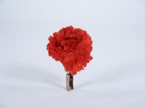 A red carnation made of cloth with special brass gimmick made to last a lifetime. Includes illustrated instructions by Ireland Magic Company Chicago. If desired the flower may be replaced with another. Condition very good.