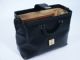 Made of black leather with top opening metal rails which enable the bag to be set in the open position where it will stay for easy access to contents or for a quick ditch of an item. Bag in open position measures 14” wide x 6 1/2” deep x 11 1/4” high having a strap closure coupled with a dual combination lock. Inside you will find an open pocket along with a zipper close pocket. Condition very fine.