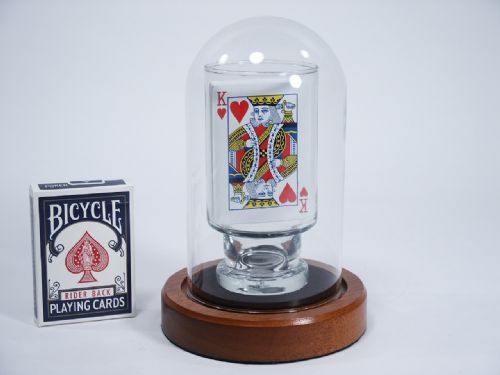 After two cards are selected by spectators they are returned to a glass which is set upon a small pedestal and a glass globe placed on top and all covered with a silk handkerchief (not supplied). The performer commands the first card to travel horizontally through the pack and appear at the face of the deck. The handkerchief is removed and it is seen that this has happened! This card is removed and the globe and handkerchief are replaced. The second card appears in the same way! This is a beautiful unit from 1990 and includes 2 pages of instructions. Condition First Rate as New.