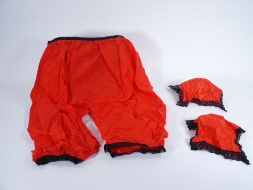 A black cloth bag is shown empty inside and out. Two red handkerchiefs edged with black lace placed within vanish and then reappear again. Back in the bag they go and suddenly the bag transforms into an old fashion pair of red bloomers trimmed with black lace! All self-contained with 2 pages of instructions with routine for comedy. From Great Britain, 1984. Condition as new.
