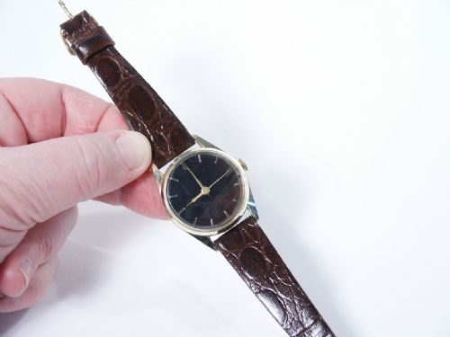 A Swiss made watch with gold hands against a black face which after a few seconds materializes the ESP symbol of wavy lines and then the symbol goes away. Condition fine.