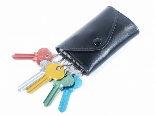 The wallet is leather and the length of pull is 41” with locking feature at any length and just a slight tug will release the lock. The reel is from Great Britain and someone has attached key blanks to the individual hooks and inside a sleeve of the wallet is a matching key to one of those seen. Condition very fine.