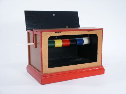Cabinet measures 9 3/4” wide x 6 5/8” deep x 6 3/4” high having a door closure at one side of cabinet and an open view on the opposite side also having two doors the vertical length on the top of the cabinet giving access to the interior and a vertical slot in which a 14” knitting needle may be placed down into. You will also find a secret panel that pivots up from the bottom of the cabinet which stops at the vertical just below the slot the needle resides in. Also this pivot up section has a trough which it is assumed to hold a roll of beads for the needle to enter. This does include seven different color cylinder shaped beads of wood. The mystery is for you to solve as there are no instructions but this is such a well made piece. Auctioned in as is condition.
