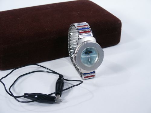 Said to be the perfect watch gag. With the push of a button, the watch jumps open and the watch movements springs up. This also includes miniature cards for a card revelation if desired. Also included a wire with alligator clips on either end so that you may walk up to a spectator also wearing a watch saying you need a jump as your battery is dead and when you clip the other end to their watch it springs open. Includes instructions. Condition not working but likely needs a new watch battery otherwise very fine.