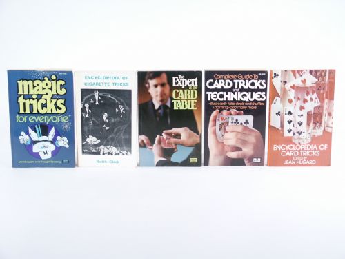 Magic Tricks For Everyone by Professor Henri Garenne, Encyclopedia Of Cigarette Tricks by Keith Clark, The Expert At The Card Table by S.W. Erdnase, Encyclopedia Of Card Tricks by Jean Hugard, Complete Guide To Card Tricks And Techniques by Jean Hugard and Frederick Braue. Condition varies, but usually good.