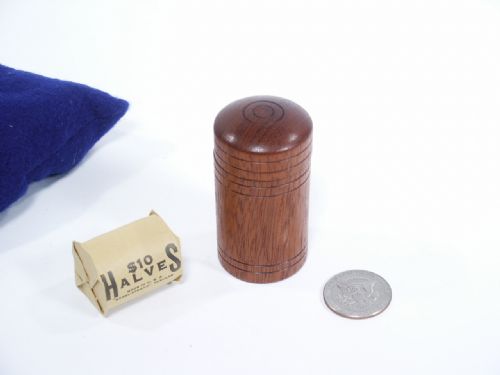 A small wooden cup and lid are shown to hold 4 half dollars (not supplied). One at a time the coins vanish from the performer's hand and travel invisibly to the cup. After the last coin travels and all the coins are emptied from the cup the magician shows the empty cup to now contain a roll of half dollars from a bank! A beautiful mahogany wood cup along with half dollar roll and additional special half dollar coin and cloth carry bag. Includes 2 pages of illustrated instructions. Condition First Rate.