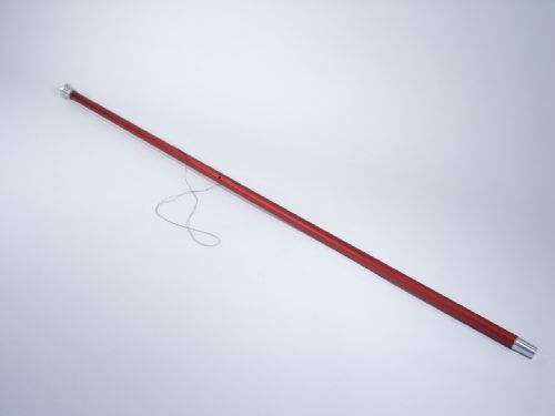 This found wrapped in a paper dated 1988 and is a two piece screw together aluminum cane in red finish with silver finish knob and ferrule. This came with a loop of black thread which travels through a hollow rivet at mid section of the cane and also includes Lewis Ganson's routine with illustrated instructions. Condition as new.