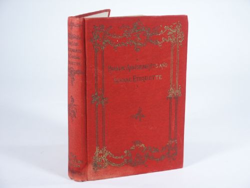 Cloth bound with gilt, 296 pages with illustrations. A handy manual of Etiquette and Parlor Games in two parts compiled by G.H. Sandison, published by The Christian Herald, New York. A fascinating look at the late 1800’s with sections on: *Punch and Judy *Sleight of Hand *Optical Illusions *The Waxworks Gallery *Miscellaneous Tricks and so much more. Condition damp stain to bottom of cover 3/4”, pages 145 to 150 have binding miss trim mid-way to foot of pages foredge only in 1/2” not affecting type, otherwise fine.