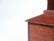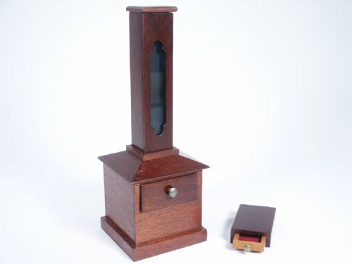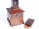 Made by Douglas-Wayne Illusioneering and part of the Hoffmann Series. This handsome mahogany wood cabinet stands 11” high having a single drawer cabinet at the base and a chimney with clear glass front at the top. Also shown is a small drawer box, made of mahogany wood. A quarter coin is borrowed from a spectator and marked for identification later. The quarter is placed in the drawer of the base of the chimney unit and closed. The small drawer piece is placed atop the chimney and the magician walks away from the unit. In a moment the quarter is seen in the glass front of the chimney making an appearance at the bottom and it slowly rises up under its own power and vanishes when it reaches the top where a knock sound is heard! The magician reaches over with empty hand and removes the drawer that had been placed on the top and gives it a shake where a rattle is heard. Opening the drawer its contents are turned over into the hand and it is found to be the same quarter borrowed and marked a few moments ago! This is a lovely piece and of clever construction in mechanics to bring about this mysterious and baffling effect. This is hallmark stamped and includes 4 pages of instructions for performance. Condition tiny 1/4” wear at back edge, otherwise very fine as it doesn’t appear to have had use.