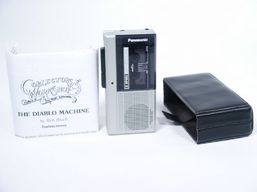 Custom leather case made for the mini-cassette machine which also includes an instruction manual. A deck of cards is tossed to a spectator, who is instructed to examine and shuffle them. Spectator cuts the deck and is instructed to place the card cut to on the table. Performer hands spectator a small mini-cassette machine. Spectator pushes the “Play” button and the performer’s voice is heard to announce a prediction of a selected card. The face down car d is turned over. It matches the prediction! No longer available. Includes instructions for performance. Condition very fine.