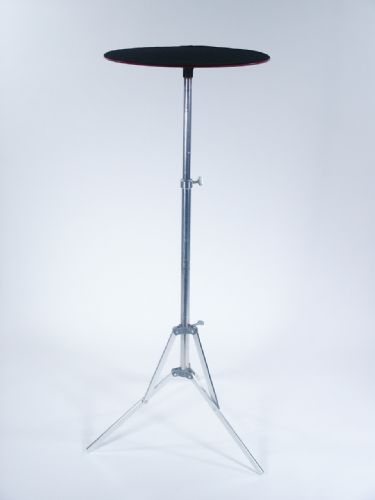 Table top is 12" in diameter and base is of adjustable telescoping post with adjustable leg spanse with a maximum height of 38". Round top is of plex that is felt covered and size makes for easy transport. Condition fine.