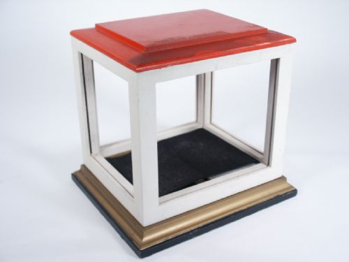 The overall dimensions are 8 1/2” x 7 1/2” x 8 1/4” high and what you have is three main pieces being the removable lid which is a bevel smooth shape at edge along with frame which has slots for sliding in pieces of plex and the mechanical base which is made with a spring loaded flap covered with felt that has shrunk in size due to age. All made of wood with exception of metal panel in the spring loaded device in base. Condition as stated.