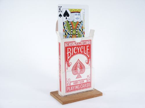 Includes stand and Jumbo Bicycle Deck. The jumbo deck is given to a spectator to examine and shuffle and two spectators each select a card. The cards go into the deck which is cut several times and placed back into the empty case. The case is left in its stand and the magician may go down into the audience. The spectators are asked which cards they selected and slowly the first card rises out of the deck after which the second card rises as well! Includes 4 pages of illustrated instructions. Condition very good.