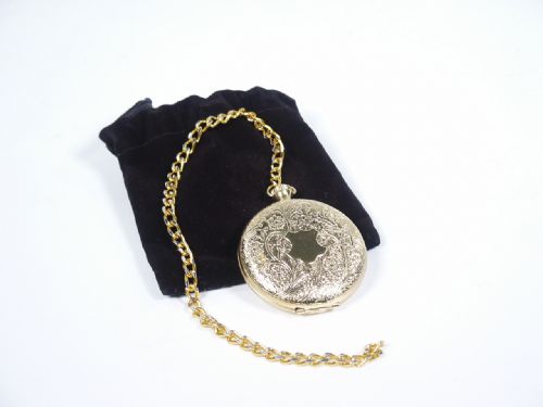 Produced by Jack Dean’s Stagecraft. A pocket watch on a chain is removed from a cloth bag and opened to show its face and it is closed and laid aside. A spectator grips a marked half dollar inside of a handkerchief and performer claims the watch may be used to hypnotize him and make him believe that the coin has vanished and reappeared in the cloth bag. After the attempt to hypnotize the spectator with the gently swaying watch he says he still has the coin. The handkerchief is opened and the watch face is found! The missing coin is discovered inside of the watch case and it is handed to the spectator who verifies his mark! Includes 5 pages of illustrated instructions. Condition very fine.