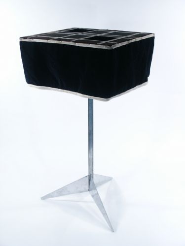The Deluxe model complete, measuring 31 1/4” high, with 14” x 16” top with two black art wells and drape which had the features of being streamlined, lightweight, modernistic and all metal with exception of the wood top. Condition very good.
