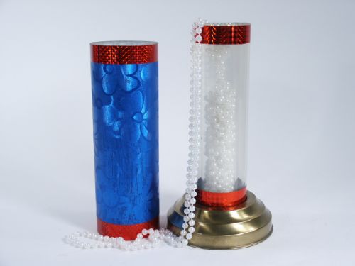 This stands 12” high and quality made with durable thick wall tubes and metal base and operates much like the classic crystal silk cylinder but the difference with this apparatus is that the inner fake has another tube fastened to the inside of the main fake that is 1/4” higher than the larger main tube. This was found with the inner part of the fake being filled with 4 strands of pearl necklace beads. It is possible this outer section could be filled with colored sand or salt or even silk that would hide the inner load of beads. No instructions. Condition very good.
