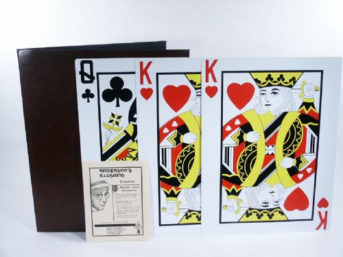 A three card Monte that cane be seen by a large audience as the cards are 18” x 24” and beautifully silk screened with a handsome carry case. This is a Limited Numbered Edition and comes along with a booklet with step by step illustrated instructions and patter to go along with the routine. Within the booklet it mentions a signed certificate which is absent. Condition this doesn’t look to have ever been used, very fine.