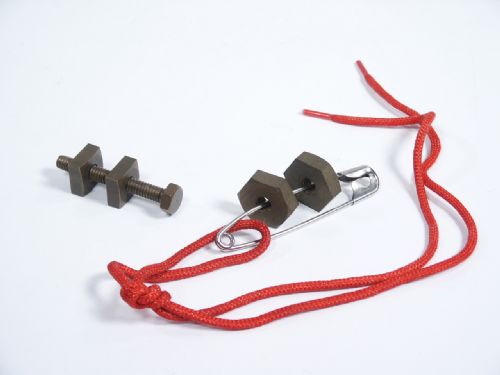 The Johnson nuts are square with threaded bolt addition and the German made are hexagonal along with large safety pin and red lace. Instructions included for the Johnson Products included. Condition very fine.