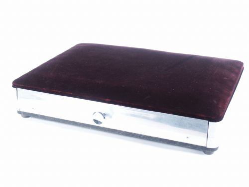 Made of 1/4” Birch ply with 1/2” poly foam top covered with Deluxe Velvet and edges trimmed in highly polished aluminum. This is a drawer unit divided in four sections and has a flange mounted underneath if wishing to add a stand. Top measures 17 1/2” wide x 12 1/2” deep having a height of 3 3/4” on four nylon feet. The velvet is treated with scotch guard and in black which contrasts nicely with the polished aluminum. A quality made item you will find use for. Condition very fine.