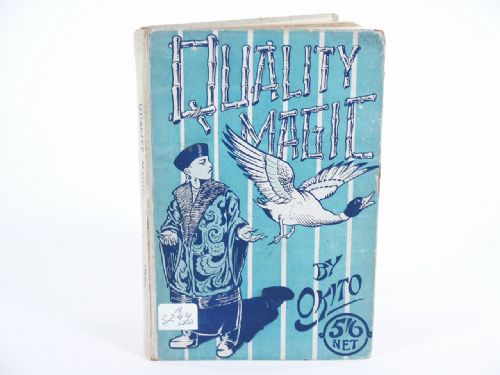 | 1921 By Okito, Published by Will Goldston Limited, London. Pictorial boards, 98 pages plus Index and ads, illustrated by line drawings and half-tone plates. Index: The Bambergs, Thimble Sleights-A Vanish And Recovery Of Thimble, Coin Sleights, Single Handed Sleights, Billiard Balls, A Deceptive Change Of A Card, Cigar Manipulation, Card Tricks-Okito's Card Mystery, The Envelope Mystery, Okito's Thought-Reading Cards, Small Effects-The Hindoo Talisman, The Lemon and Bank Note, Vanishing Cloths, Coin Tricks-The Flying Coins, The Improved Coin Ladder, Big Effects-The Sympathetic Colours, The Bewitched Blocks, The Japanese Glass Shades, The Mysterious Casket, The Bowls of Gobi-A Chinese Fairy Story, Okito’s New Handkerchief Tray, The Siamese Cylinders, Multum In Parvo and more. Condition private collection label to front cover, light foxing page edges and first few pages in, light wear to cover, otherwise fine. |