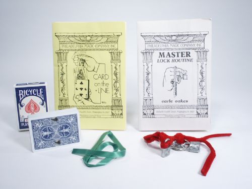 Two effects from the Philadelphia Magic Company (Earle Oakes), both include instruction booklets with wonderful illustrations by Oakes and with all necessary props for the two effects. The Lock Routine was inspired by a Ring Off Rope described in the book “Variations” only using a small padlock and velvet cord. The Card On The Line is made up with a poker Bicycle deck which has holes cut in each card. A ribbon is allowed to enter the deck as it is riffled and holding the ribbon by the ends the performer pulls the ribbon from the deck and one card is threaded onto the ribbon and you guessed it, it is the selected card! Condition very fine.