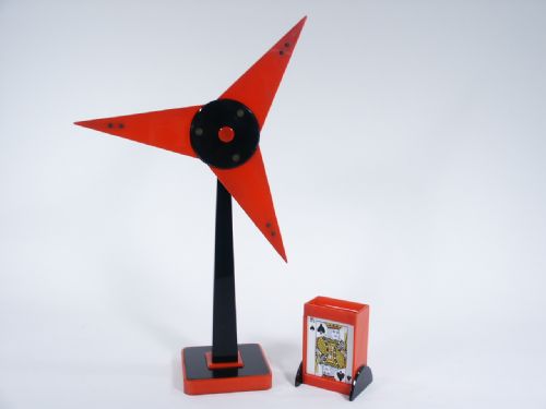From Silray in Scotland and made in plex of black and red. Stands 17 3/4” high and made with brass fittings which will hold three cards upon each point. The magician begins by having a deck of cards shuffled by a spectator and then placed in the matching style houlette. Nine cards are counted off the deck and the spectator freely selects one of them. This card is shuffled back in to the reamining eight until completely lost. These cards are clipped in groups of three at each point of the star and the star is spun and the spectator stops it at any point and that group is removed. This is repeated and a second group removed. The remaining group is now separated and one card is placed on each point of the star. Two cards are eliminated as before leaving just one card. Low and behold this last card is the selectard card! This is a rarely seen item and includes 5 pages of instructions with patter included. Circa 1950. Condition the houlette has been broken and glue repaired not affecting performance of effect. The star spins freely and in First Rate condition. Includes cards.