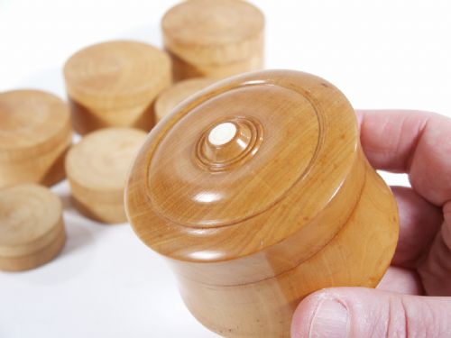 This set is testimony to a wood turners skill and largest box measures 2 13/16" diameter being 2" high and smallest of nest is 1 1/2" diameter. A really beautiful set and very hard to find. No instructions. Condition beautiful.