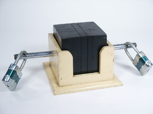 A block is shown in a stand with a rod through it with padlocks on either end preventing its removal. It may be handed to a spectator with the request they try to remove it which of course they fail. You remove the locks and the rod and show the block around. Patter may be around Houdini and his marvelous magical effects and the block is placed back in and secured with rod and locks. The finale to your story line is that that you pull the block straight up and away from its imprisoned condition and they see the rod still in place! Includes 2 pages of instructions. Condition rod has some oxidation near ends, otherwise very good.