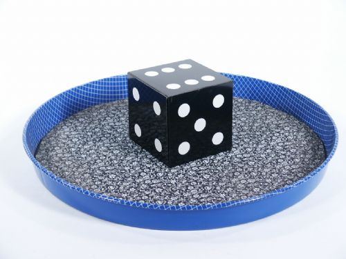 This is the stage size version using a black die with white spots that is 2 3/4" in size. In this beautiful effect, the magician shows a die and by merely dropping it upon the 11 1/2" diameter tray it visibly changes to another object as in a large sponge ball, sponge balls, several silks, foam eggs, spring flowers or whatever else your imagination may inspire you to work in with this marvelous piece of apparatus. Transformation items not included. Includes illustrated instructions. Condition fine.