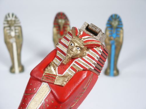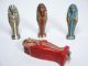 One of the Mummies is selected by a spectator and placed in the Sarcophagus with lid covering over. The two remaining mummies are hidden in drawstring bags (included but not shown) all while the performer is either out of the room or with back turned. Without touching the Sarcophagus in any way the performer is able to correctly divine which mummy lays within. This is all handmade by the later Herbert Martin Paufler and not an easy item to find. This is not a weighted method and no electronics in play. Method will be given to winning bidder. Condition one mummy has light wear to foot area, otherwise very fine.