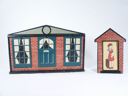 A child is seen in the doorway of a small house. She is evacuated to a large country house. Being rather particular, she insists on being shown around the house. The audience try to follow her but she is very elusive. After a lot of fun and excitement she disappears and is found back, once again, in her own little "Home Sweet Home". A great Childrens effect and much more fun than the old die box. Large country house measures 16 1/4" wide x 10 1/4" high, made of wood with three drop down doors. Small country house measures 9 3/4" high x 6 5/8" wide and is made of wood with easel standee. Includes 2 pages of instructions. Condition some of the wood has a slight warp not affecting performance on the large house, small house has a flap made of thin vinyl that has wrinkle and may easily be replaced with black cloth which is an easy fix. The doll cards have light soil, otherwise all very good and a cute effect.